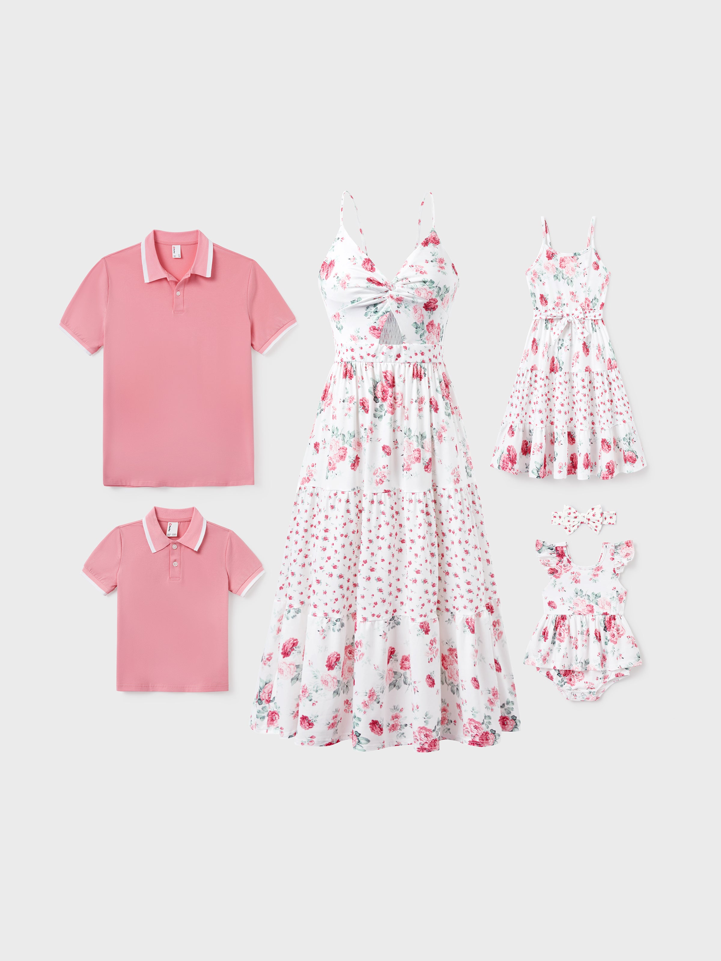 Daddy and Me Family Matching Outfits Set Solid Color Short-sleeve Polo Collar Shirt or Flower Print Hollow out Dress Pink