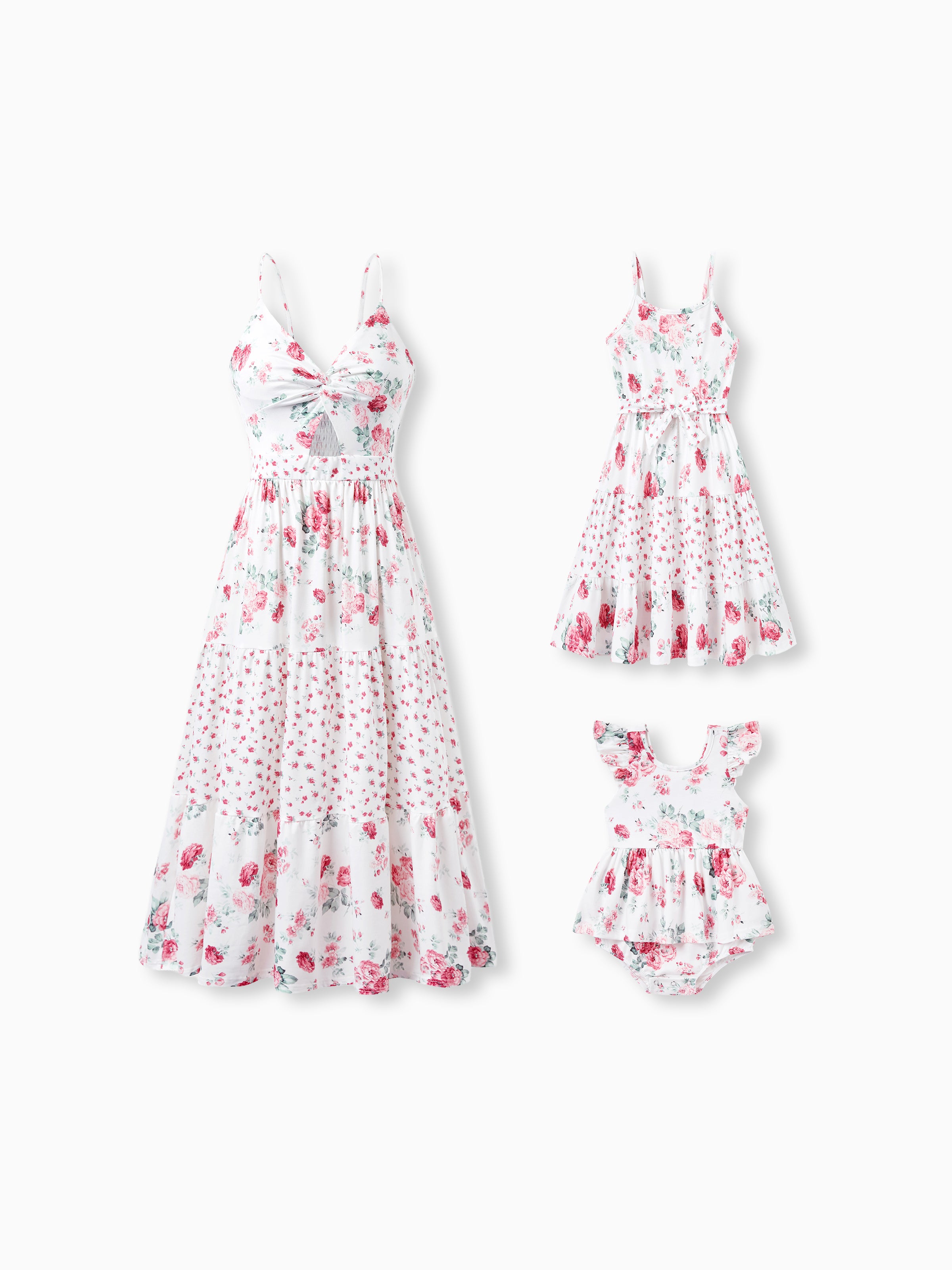 Mommy and Me Family Matching Outfits Set Solid Color Short-sleeve Polo Collar Shirt or Flower Print Hollow out Dress Pink