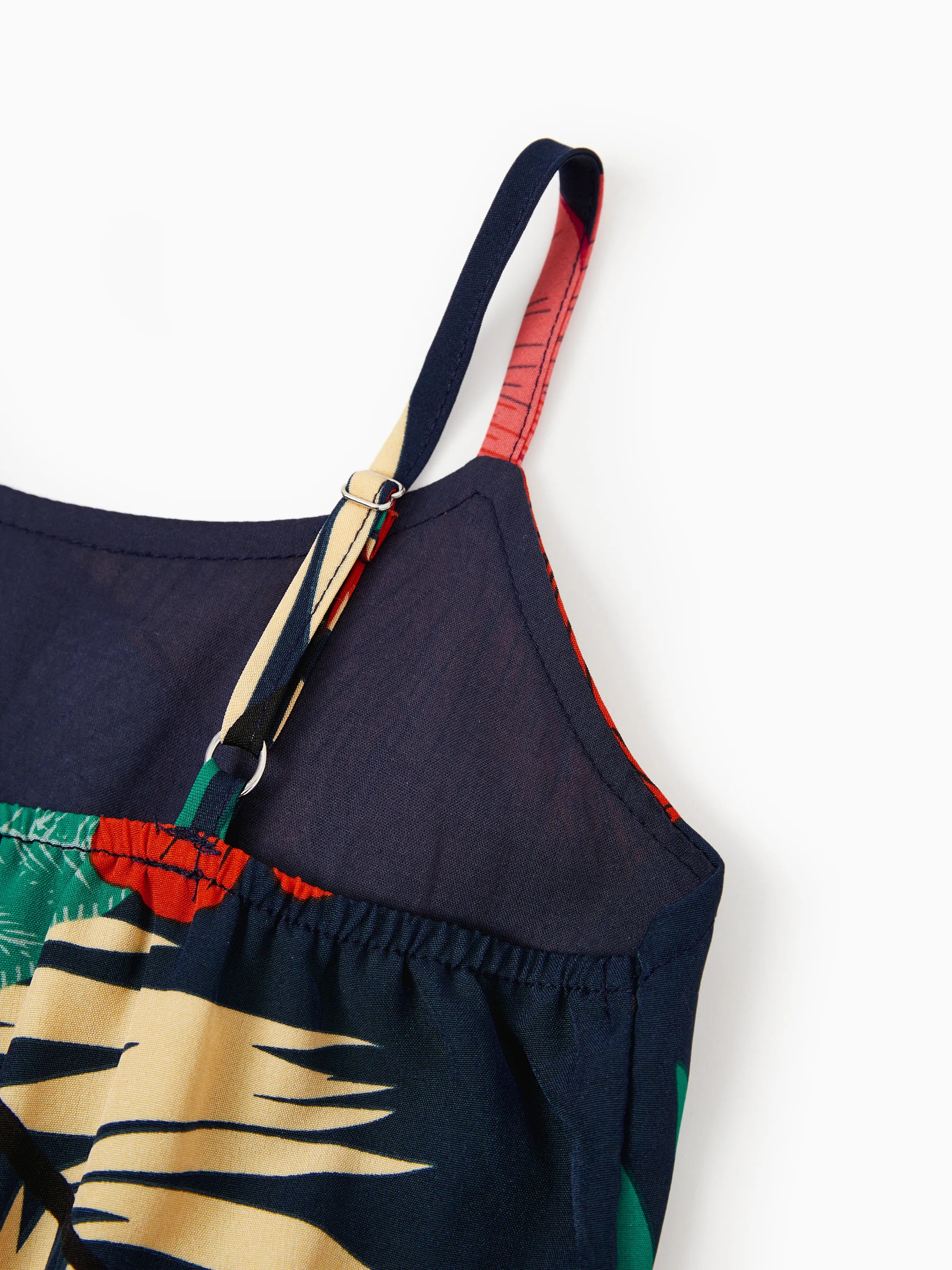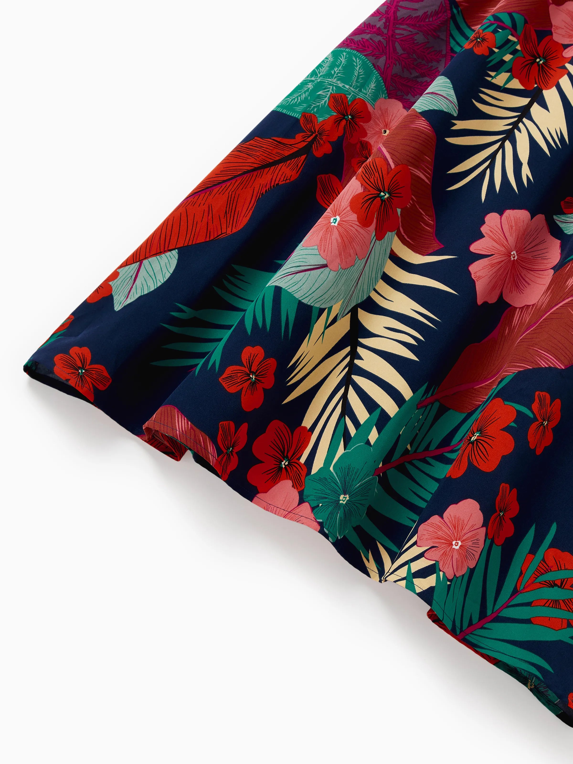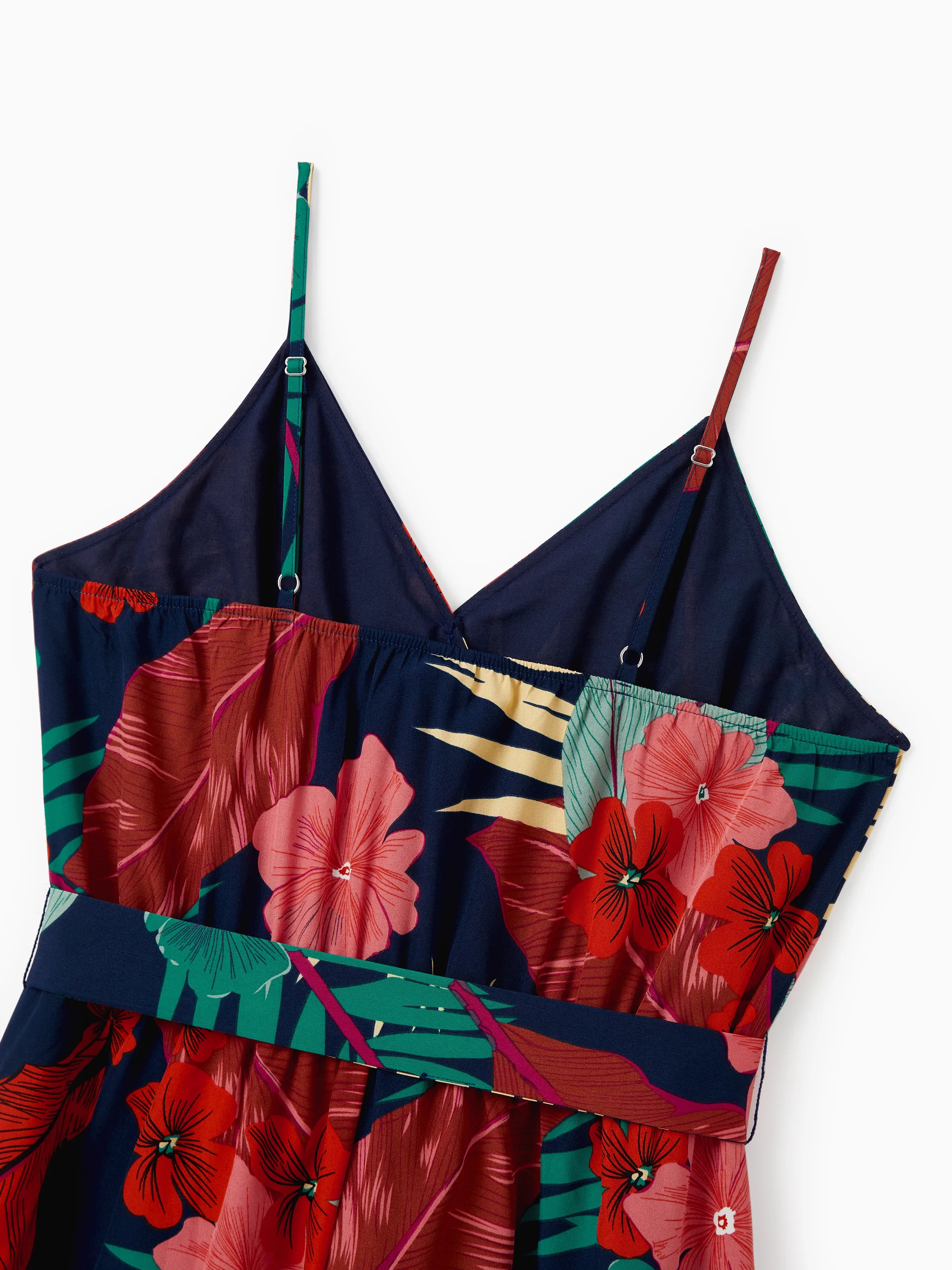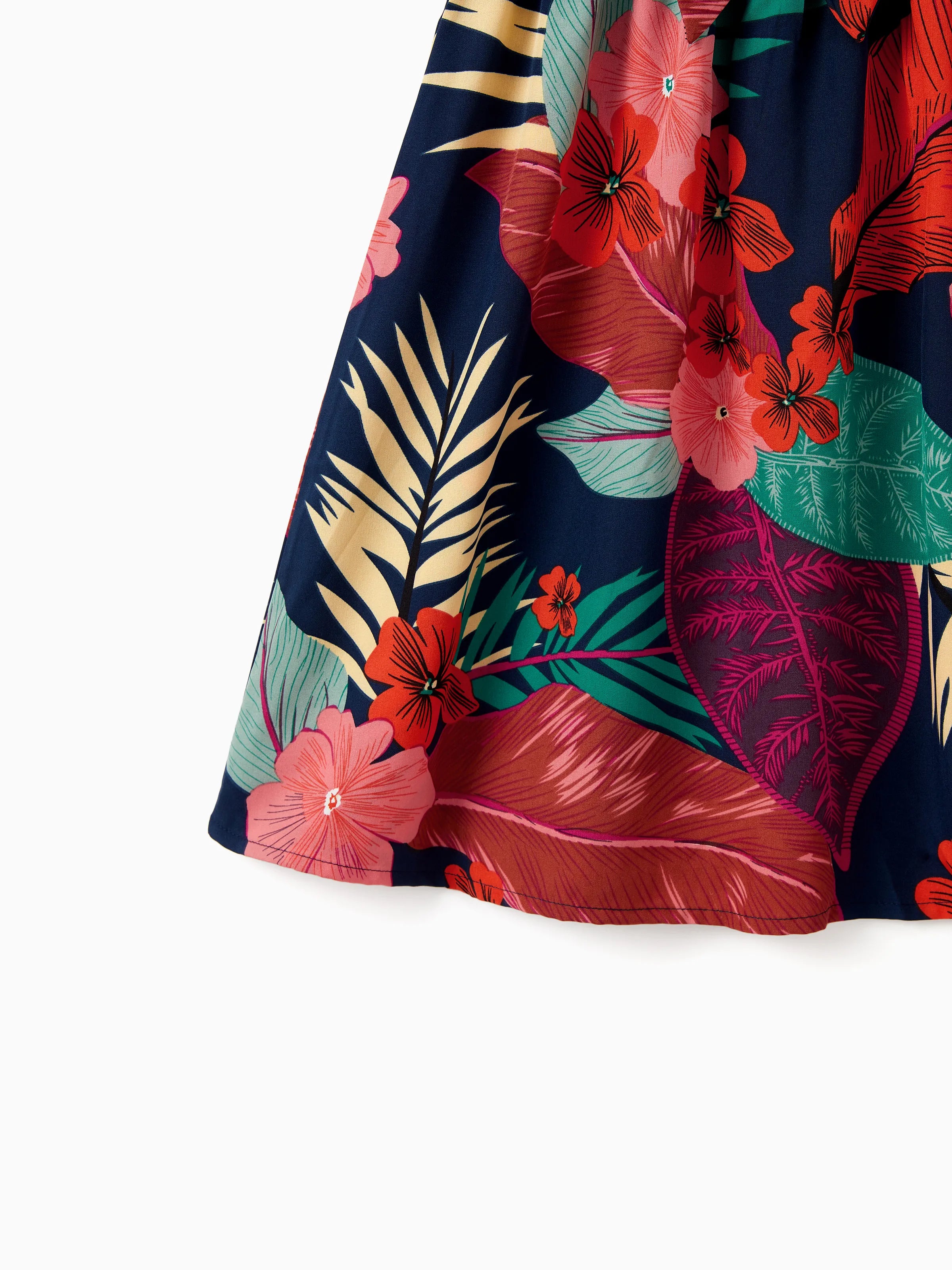 Mommy and Me Family Matching Sets Floral Panel Black tee and V-neck Strap Dress with Hidden Snap Deep Blue
