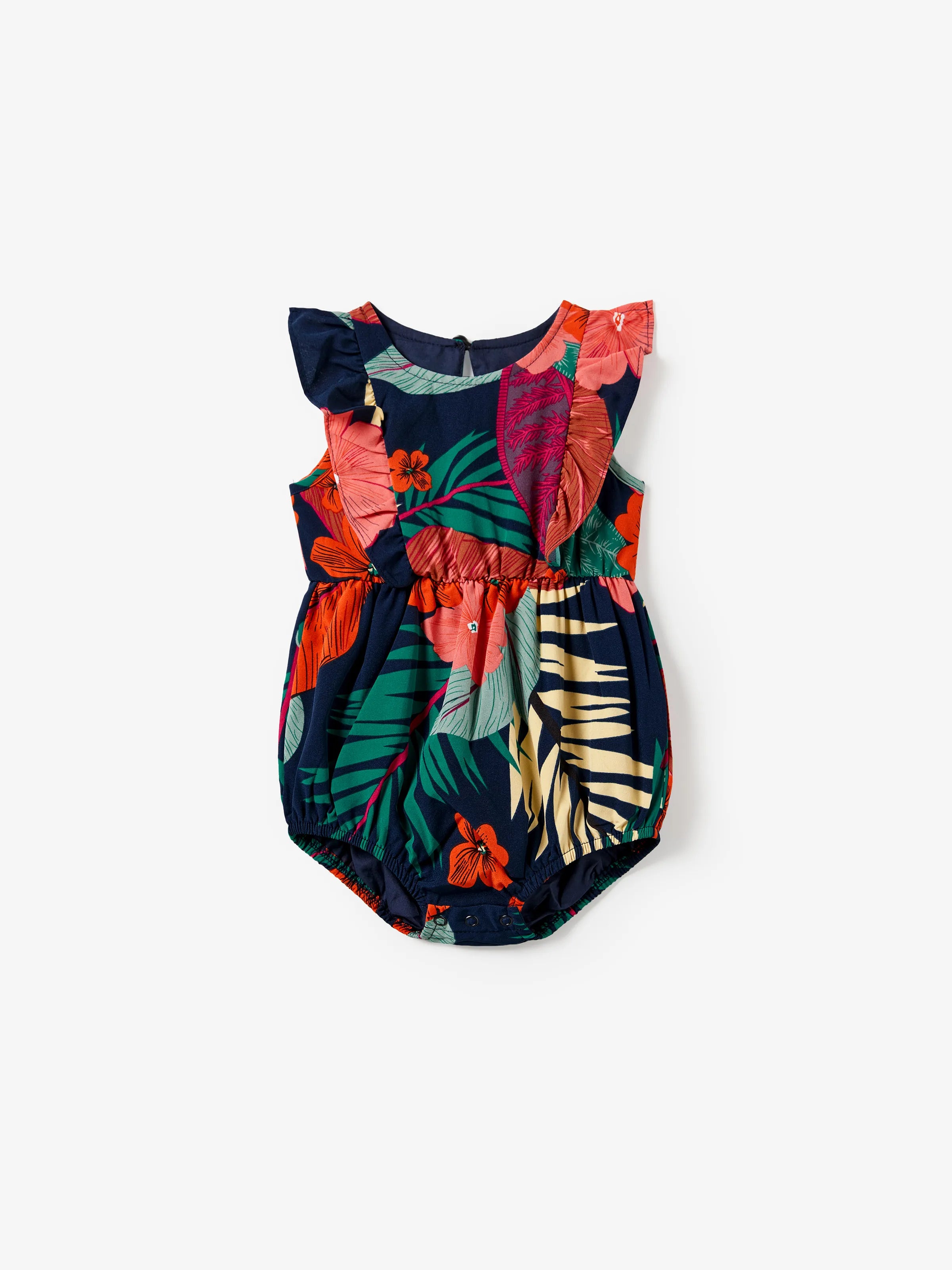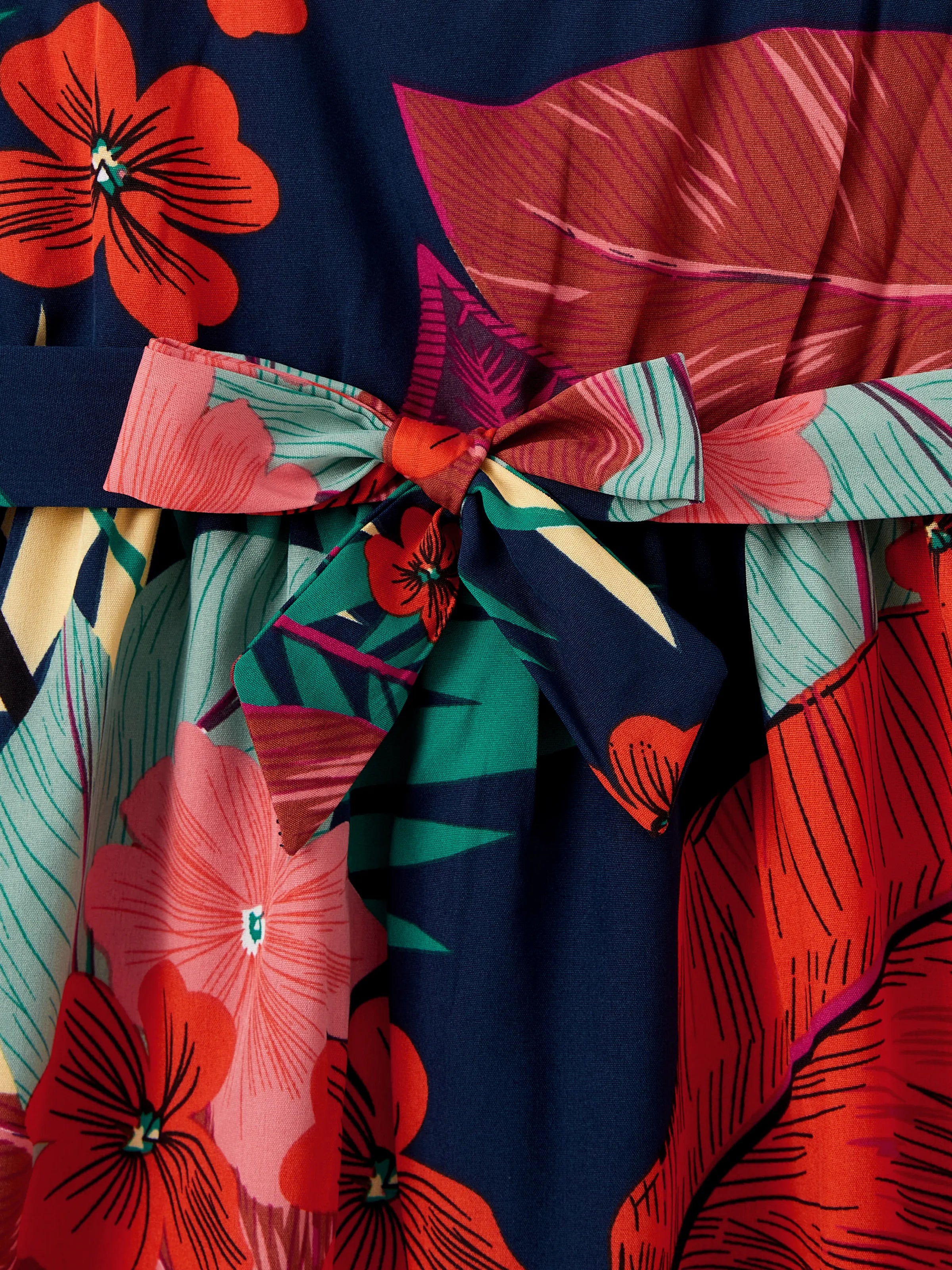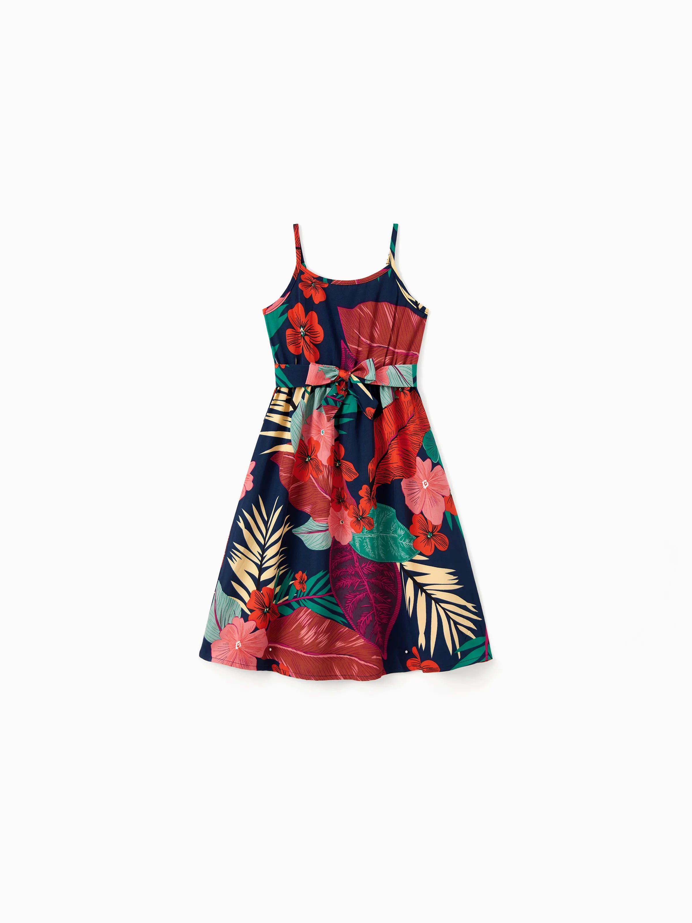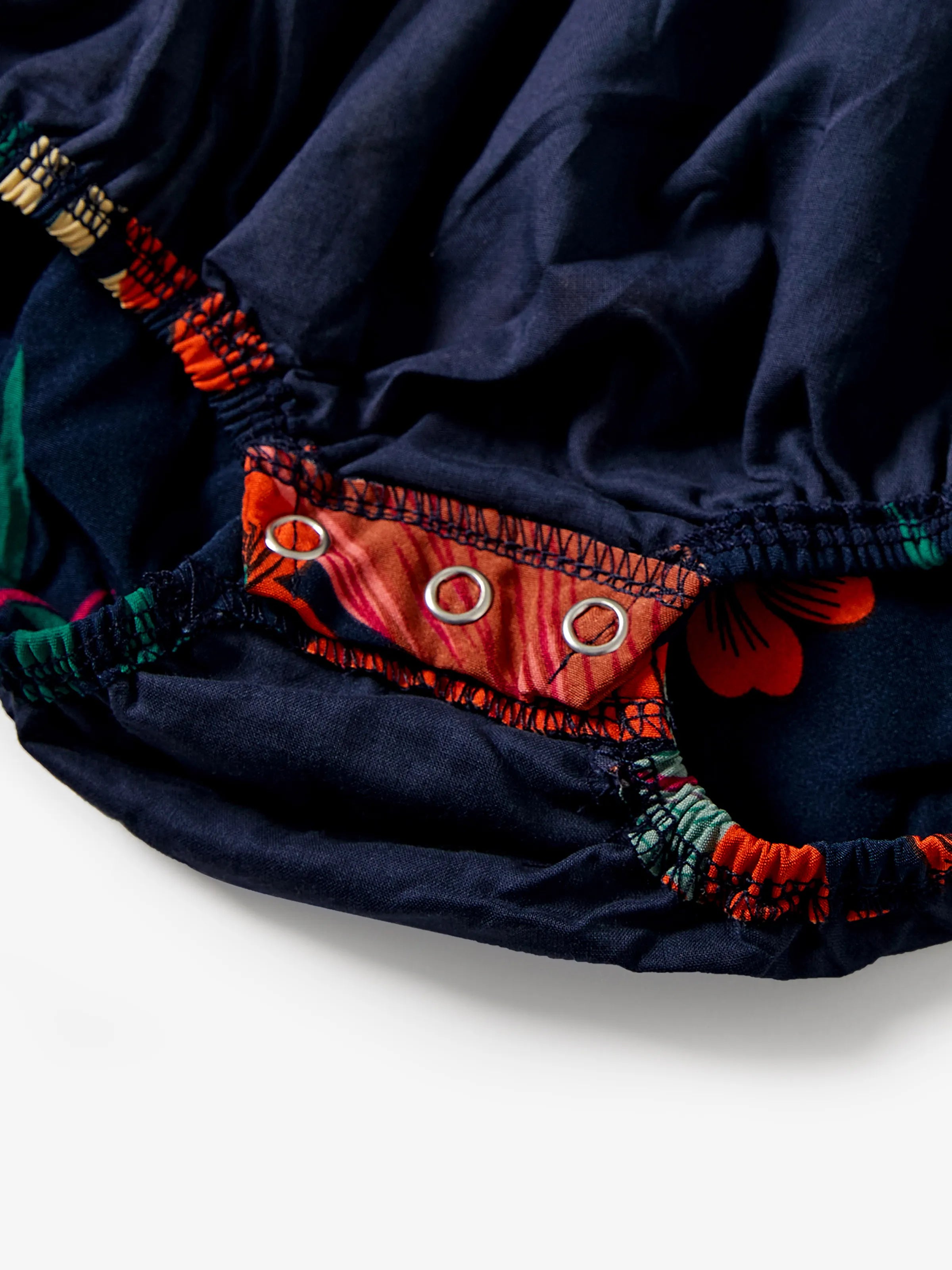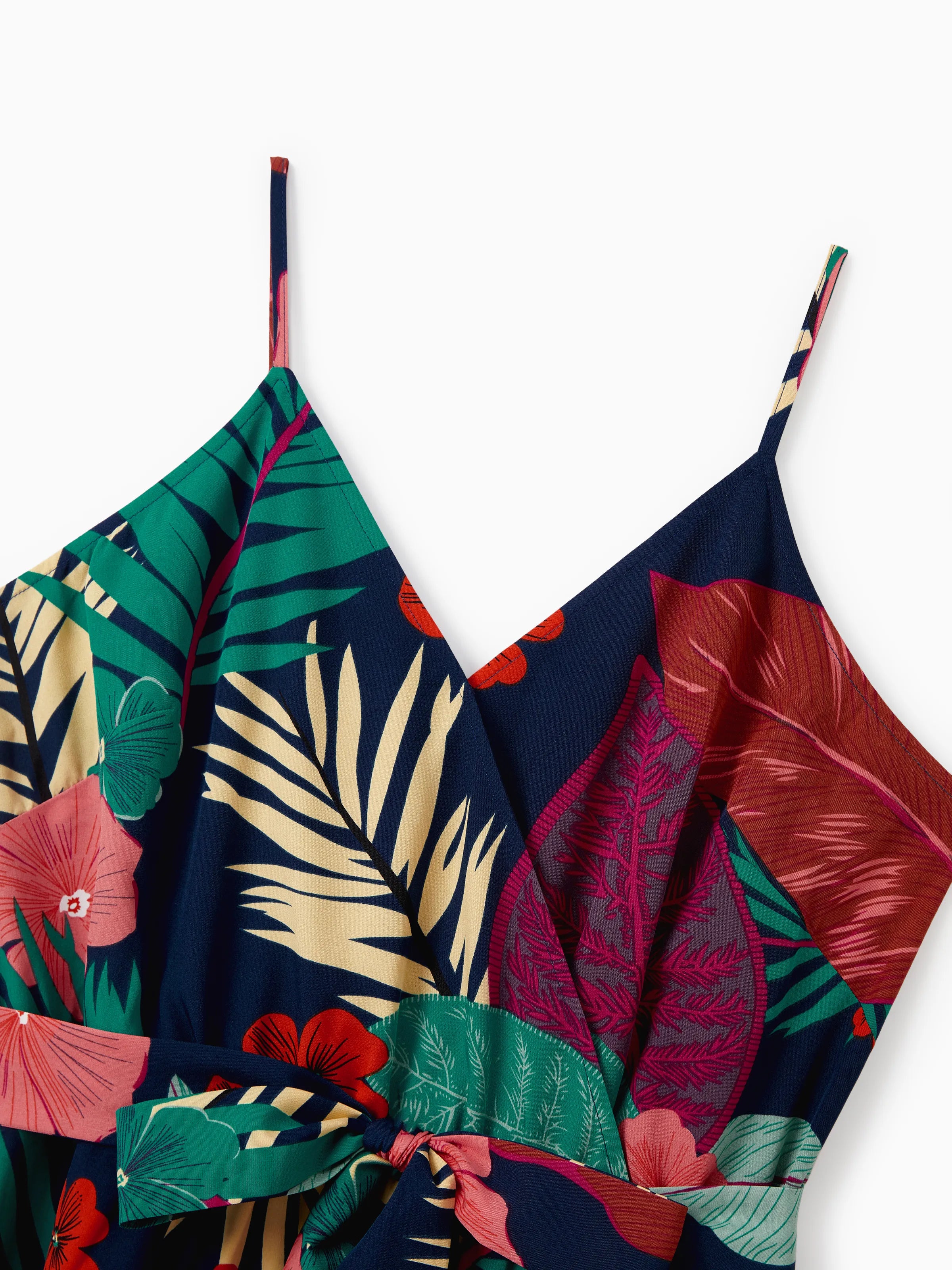 Mommy and Me Family Matching Sets Floral Panel Black tee and V-neck Strap Dress with Hidden Snap Deep Blue