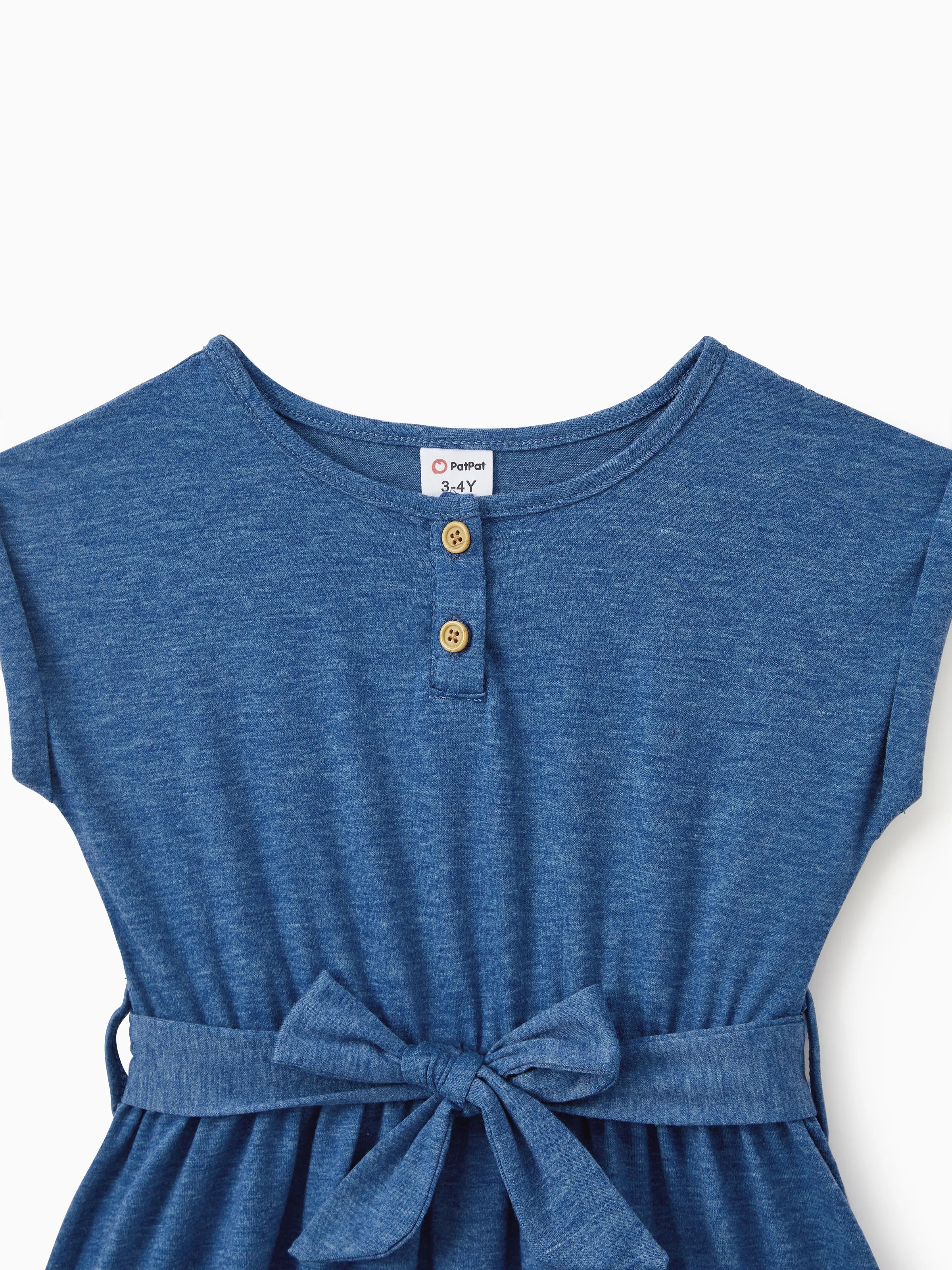 Mommy and Me Family Matching Soft Casual Outfit with Below Knee Dresses, Front Buttons, Belted Design Blue
