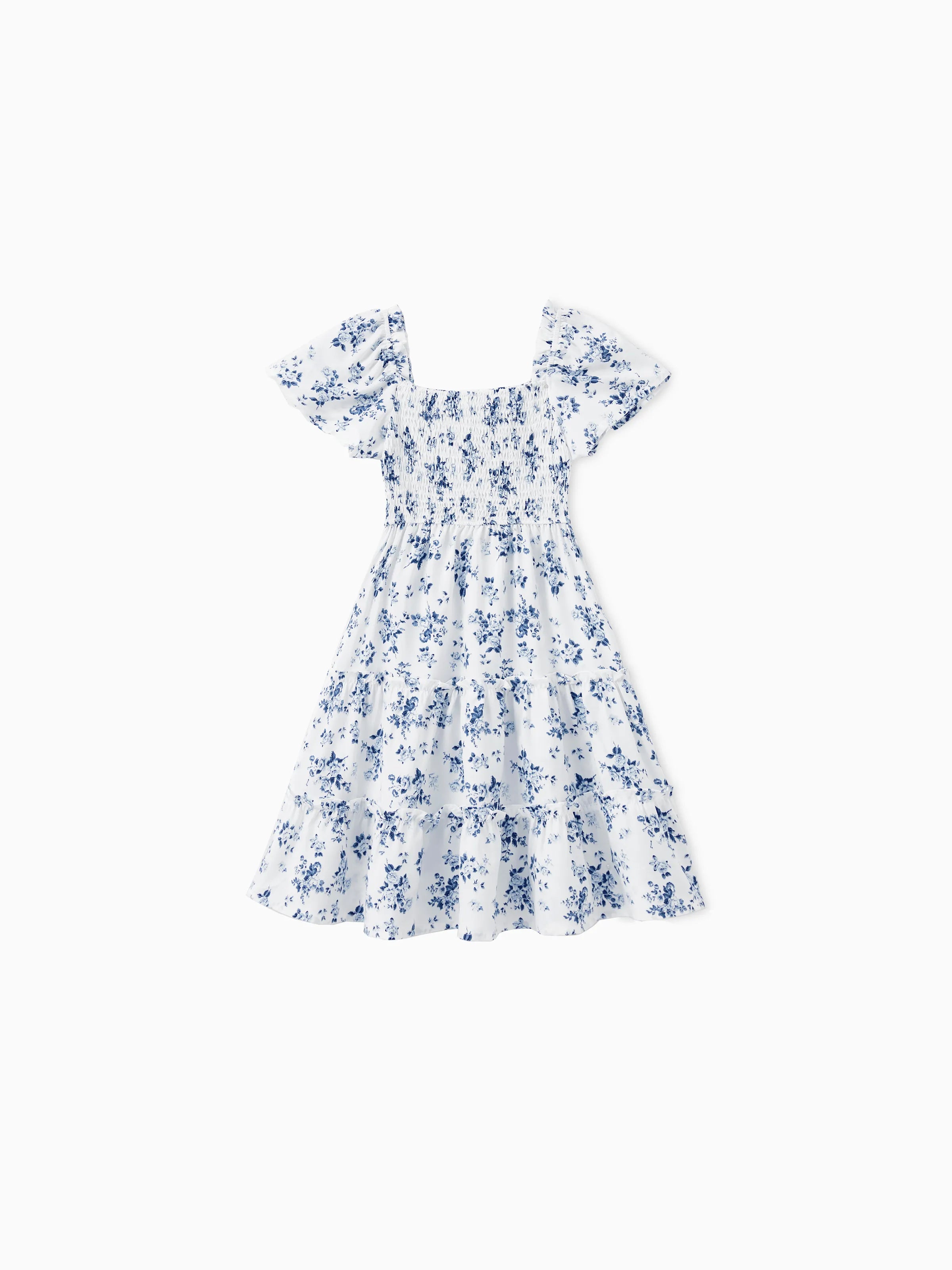 Toddler/Kid Girl Floral Smocking Shirred Casual Dress BLUEWHITE